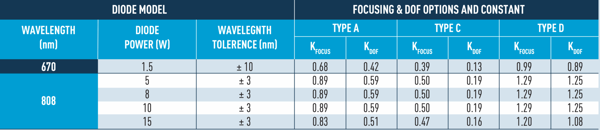Chez Osela, nous proposons de nombreuses options de focalisation différentes vous donnant la flexibilité de choisir celle qui convient le mieux à votre application. Le Fireline Laser est focalisable librement de l’extérieur sans retirer d’optiques. Dans les graphiques ci-dessous, notez les valeurs de taille de faisceau et de profondeur de mise au point (DOF), puis multipliez par les constantes K pour le modèle de diode laser et l’option de focalisation de votre choix (A, C ou D).