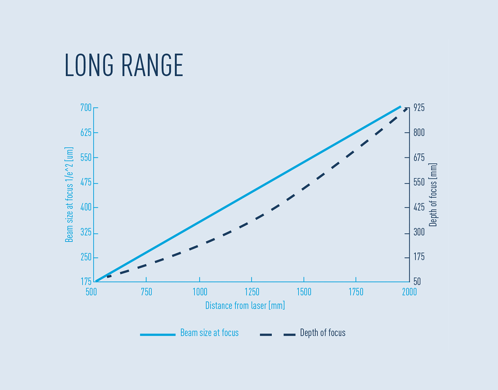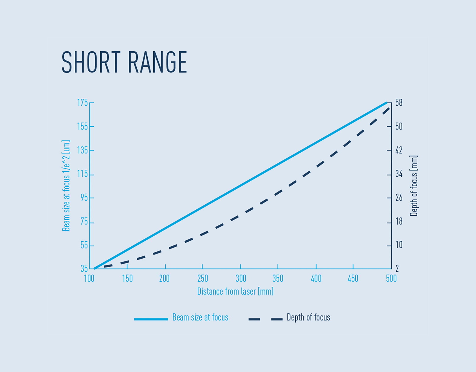 Exemple : D’après les graphiques à 400 mm de distance de travail, Focus = 140μm, DOF = 36 mm. Pour le modèle laser 808nm 10W, l’épaisseur de ligne au foyer pour l’OPTION A sera de 124,6um (c.-à-d. 140 um x 0,89). Sa profondeur de mise au point sera de 21,24mm (c.-à-d. 36mm x 0,59).