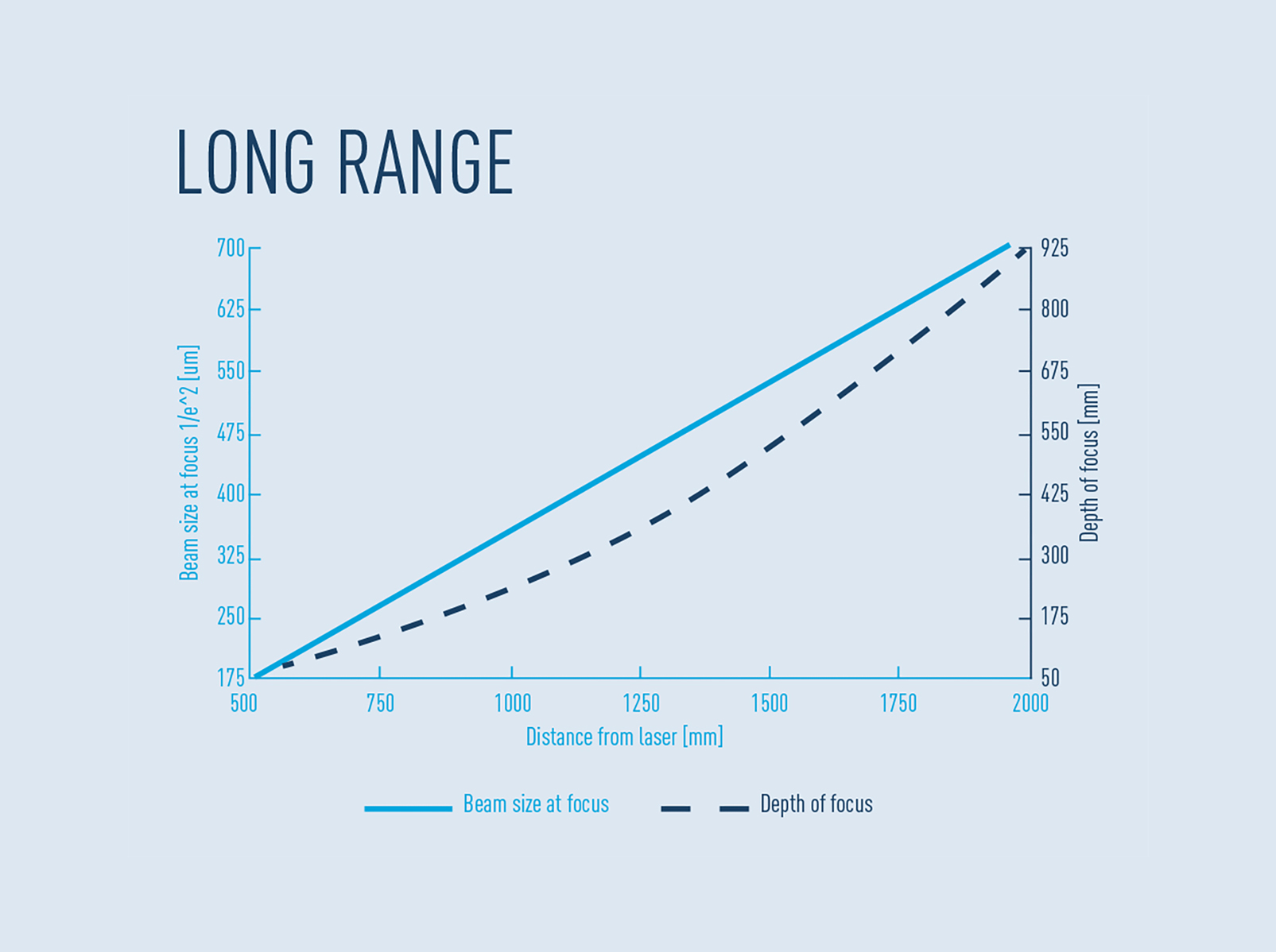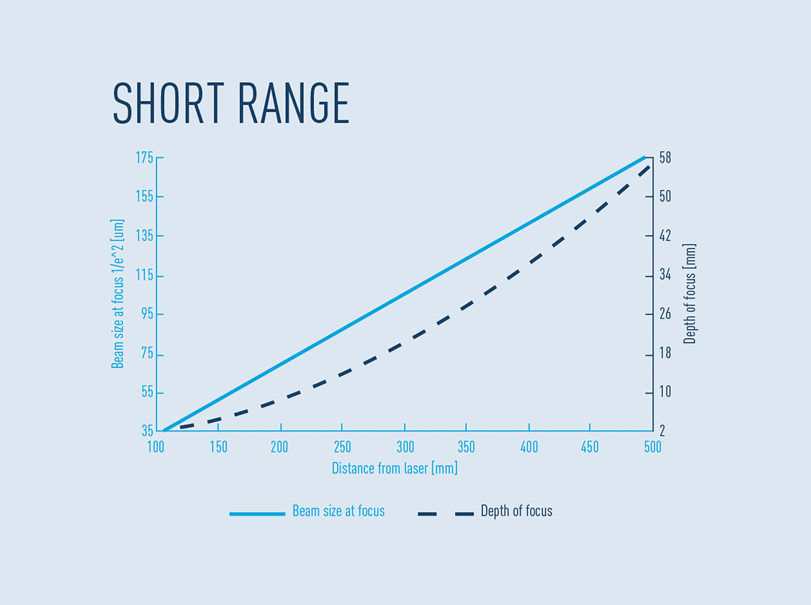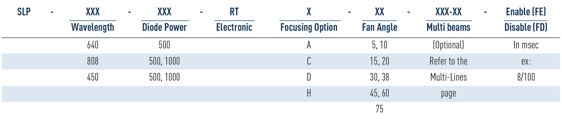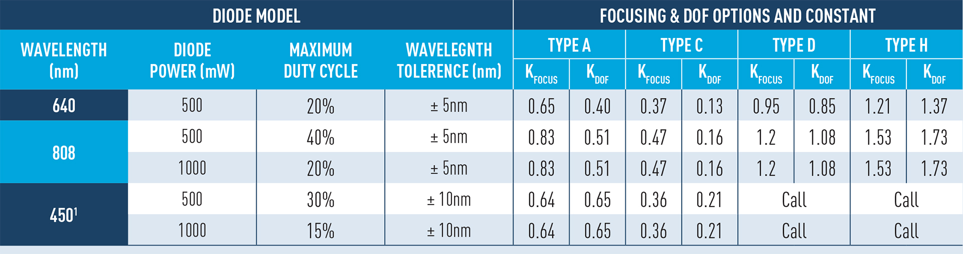 Chez Osela, nous proposons de nombreuses options de focalisation différentes vous donnant la flexibilité de choisir celle qui convient le mieux à votre application. Le laser SLP est focalisable librement de l’extérieur sans retirer d’optiques. Dans les graphiques ci-dessous, notez les valeurs de taille de faisceau et de profondeur de mise au point (DOF), puis multipliez par les constantes K pour le modèle de diode laser et l’option de focalisation de votre choix (A, C, D ou H).