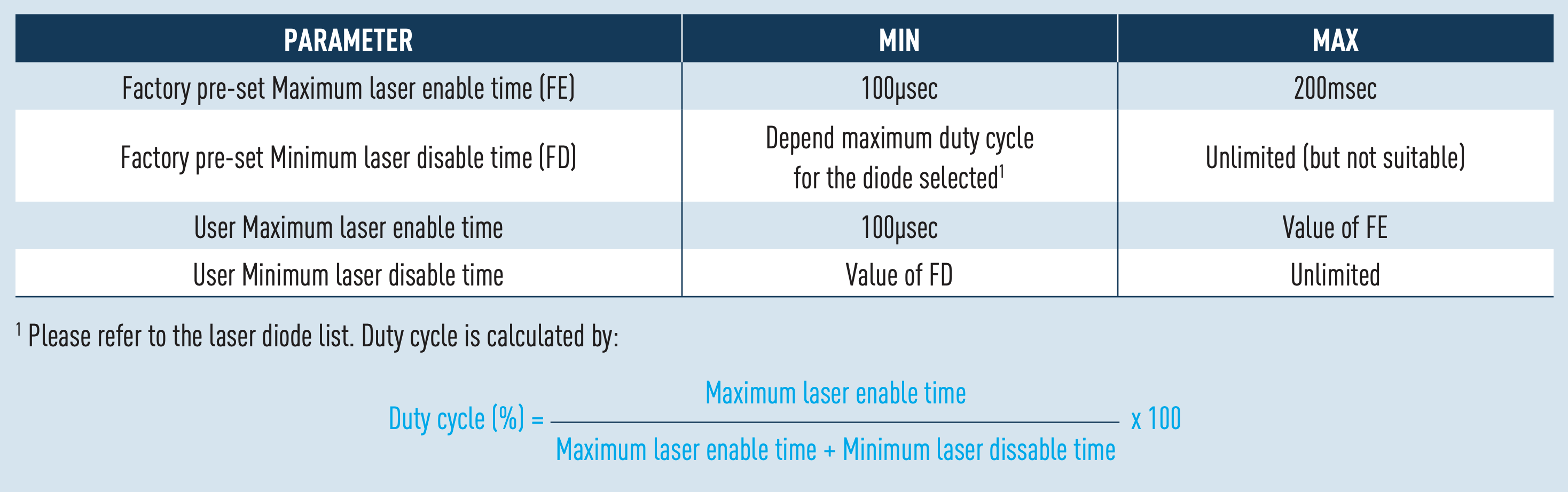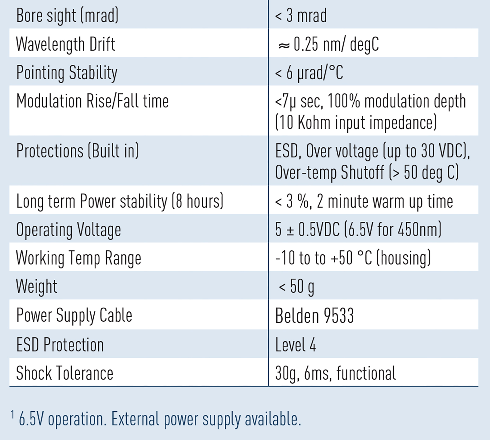 Le SL PULSED POWER est capable de fournir la puissance la plus élevée dans le plus petit format de l’industrie. Avec un microcontrôleur incorporé, il permet un temps de fonctionnement programmé en usine (temps maximum d’activation du laser et temps minimum de désactivation du laser) pour fournir une illumination haute intensité pendant une période de temps tout en maintenant une dissipation thermique acceptable. L’utilisateur n’a qu’à fournir un signal de modulation numérique pour synchroniser le temps d’activation et de désactivation de l’émission laser.