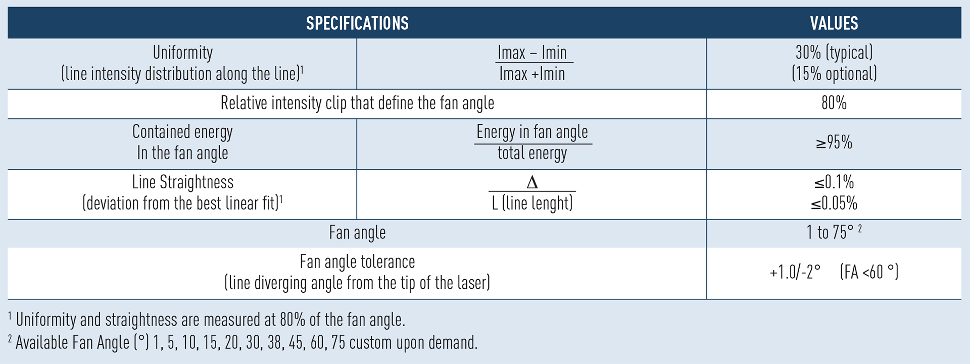 Exemple : D’après les graphiques à 400 mm de distance de travail, Focus = 140μm, DOF = 36 mm. Pour le modèle laser 810nm 500 mW, l’épaisseur de ligne au foyer pour l’OPTION A sera de 116,2um (c.-à-d. 140 um x 0,83). Sa profondeur de mise au point sera de 18,36mm (c.-à-d. 36mm x 0,51).