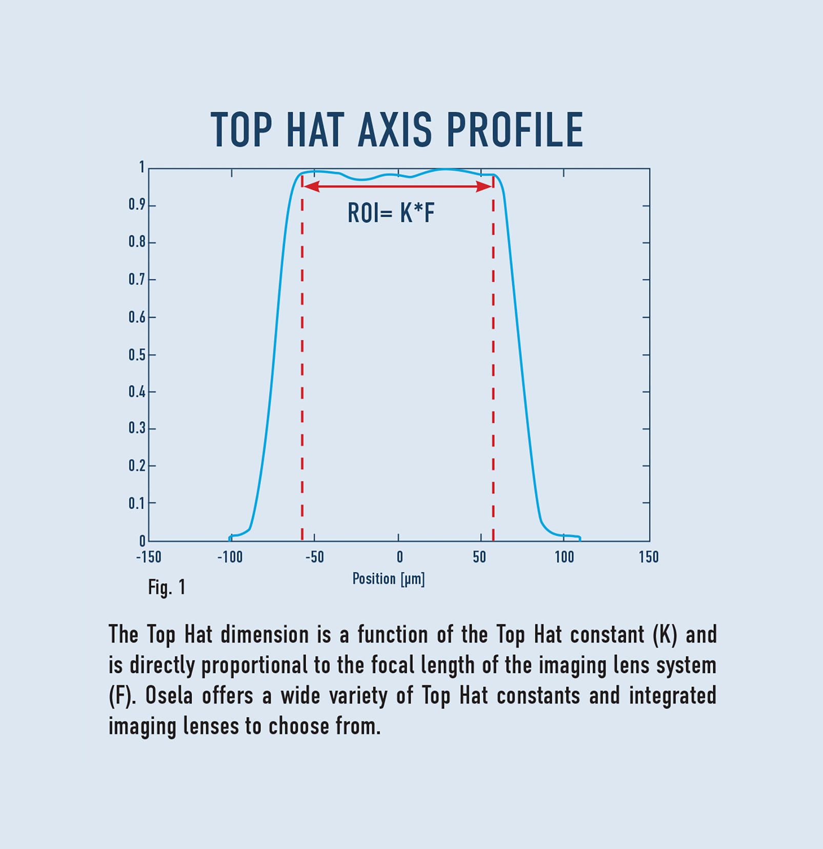 Osela’s ITH option is a fully integrated, OEM ready laser that creates a Top Hat profile of desired dimension at the focal plane of its integrated imaging lens system. The Top Hat dimension is directly proportional to the focal length of the imaging lens (F) and the Top Hat constant (K), with no additional optical system required.